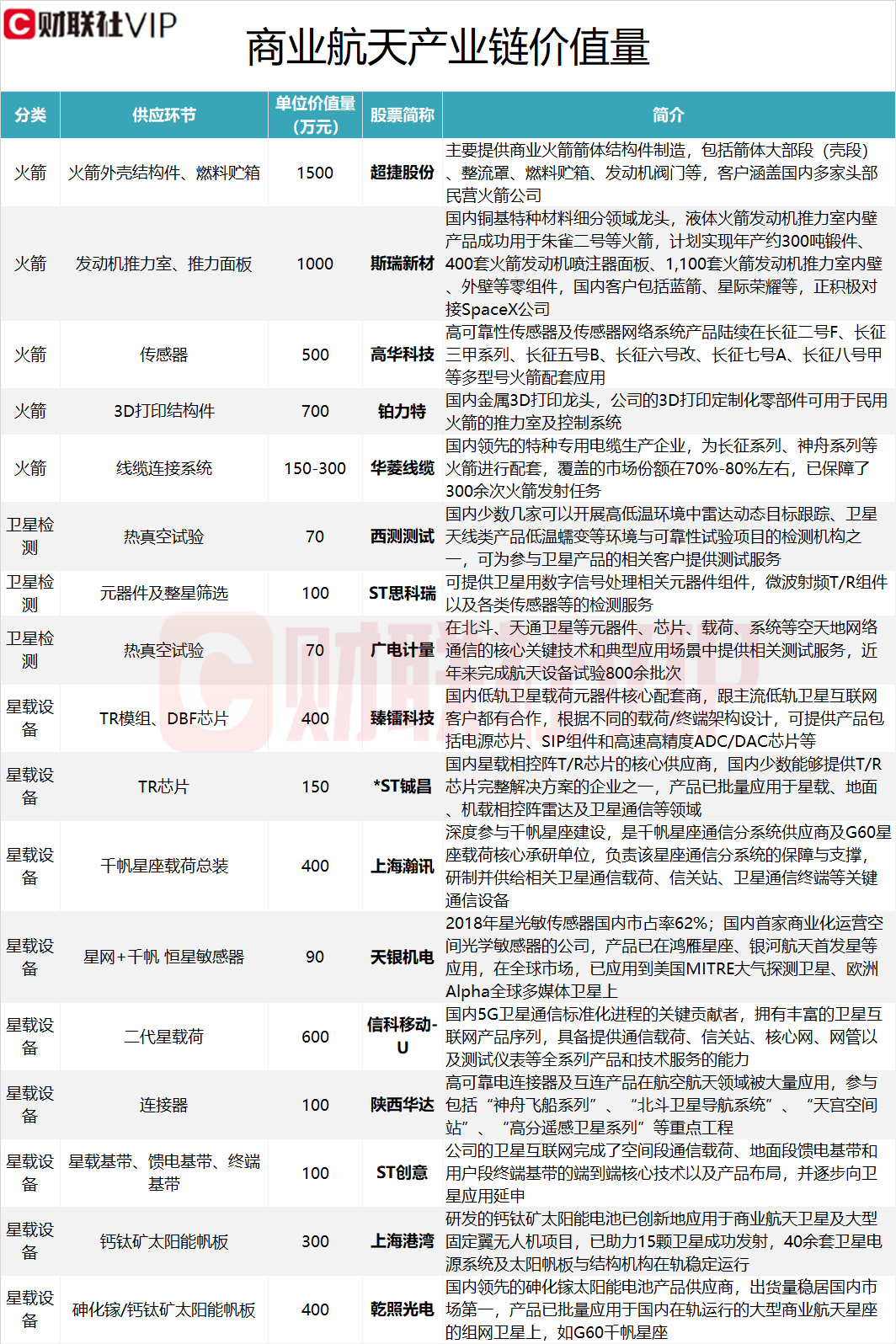 据财联社VIP盘中宝数据此前梳理,在商业航天产业链价值量中,在火箭领域★▼,供应环节为火箭外壳结构件○▼▷、燃料贮箱的单位价值量为1500万元,涉及的上市公司为超捷股份□=▼;供应环节为发动机推力室、推力面板的单位价值量为1000万元,涉及的上市公司为斯瑞新材▼☆;供应环节为传感器的单位价值量为500万元◇▪☆,涉及的上市公司为高华科技◆▲;供应环节为3D打印结构件的单位价值量为700万元■,涉及的上市公司为铂力特▽▼;供应环节为线缆连接系统的单位价值量为150-300万元◁▷,涉及的上市公司为华菱线缆。