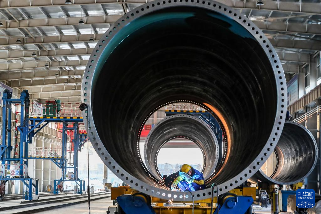 11月20日-▼▽,在甘肃省酒泉经济技术开发区的中国水电四局(酒泉)新能源装备有限公司塔筒制造车间▷…,工作人员进行风机塔筒焊接作业。