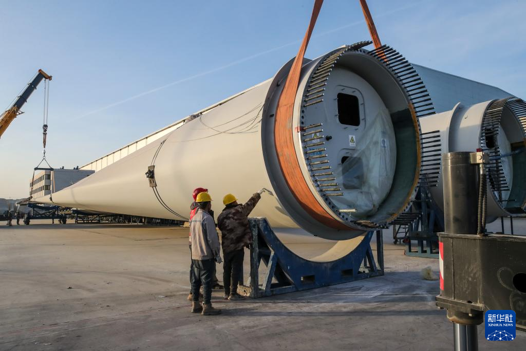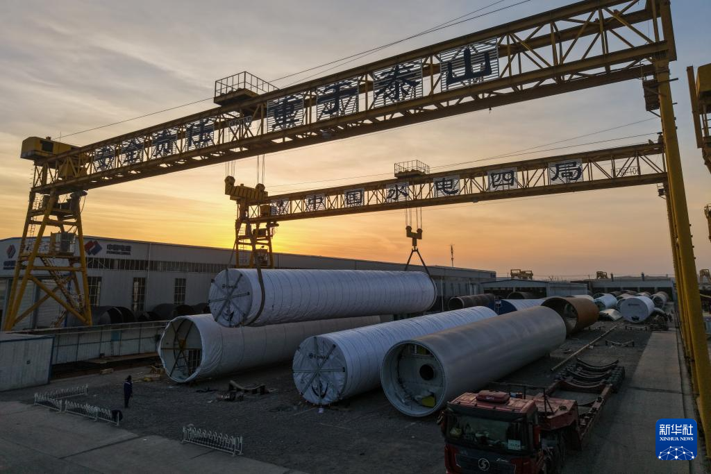 11月20日-,在甘肃省酒泉经济技术开发区的中国水电四局(酒泉)新能源装备有限公司装运生产线上,工作人员进行风机塔筒吊装作业(无人机照片)。