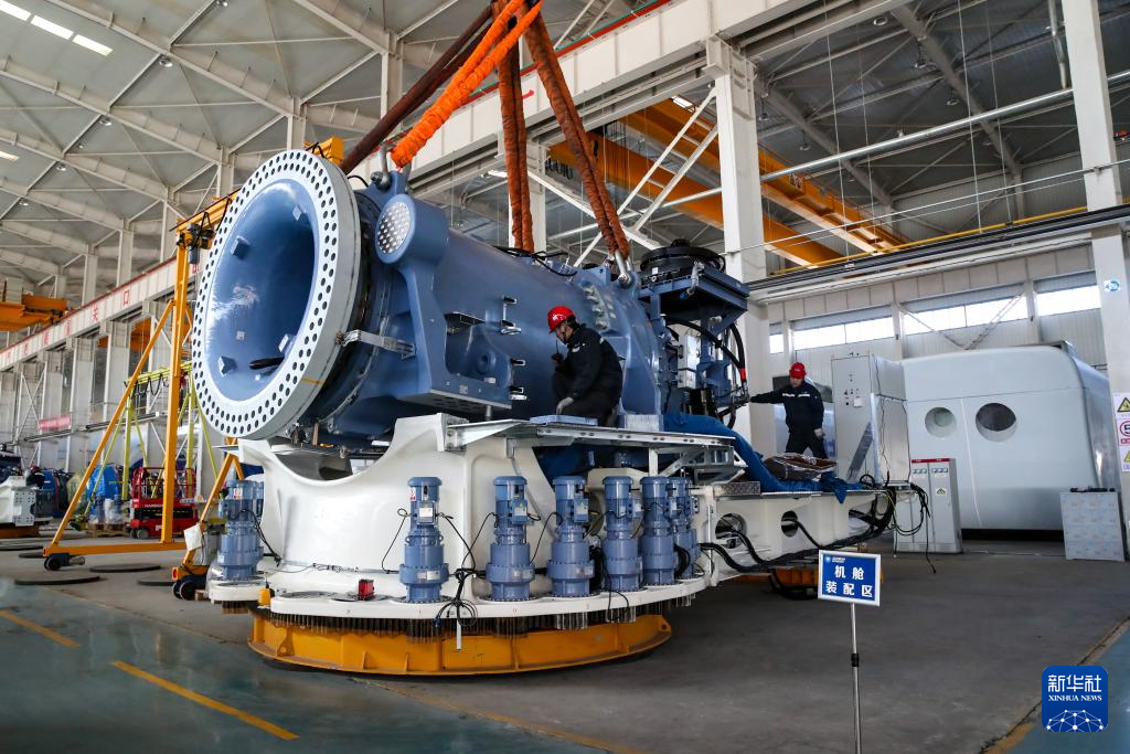 11月20日,在甘肃省酒泉经济技术开发区的甘肃省云风智慧风电设备有限公司装配车间◇-,工作人员进行传动链吊装作业。