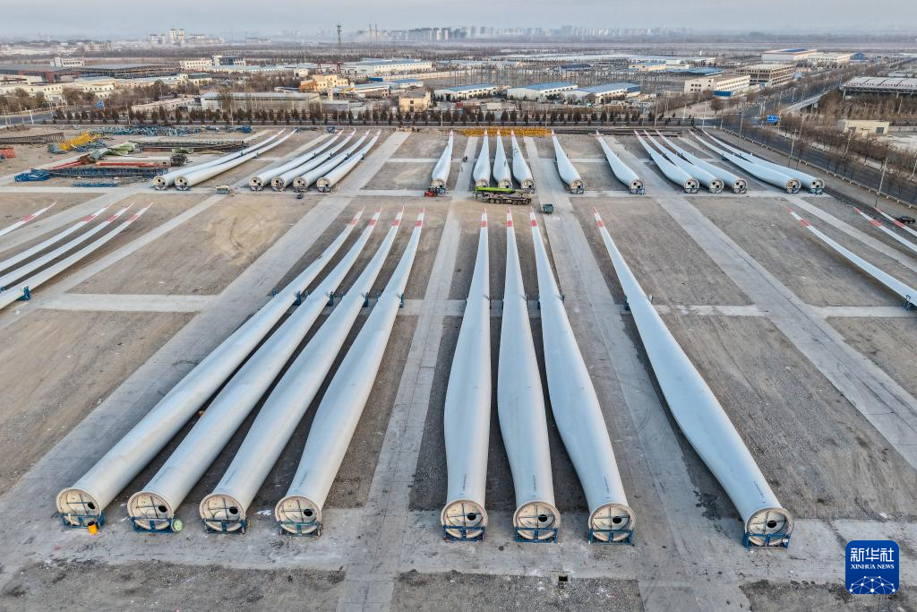 11月20日,在甘肃省酒泉经济技术开发区一家风电装备生产企业拍摄的风机叶片成品(无人机照片)。