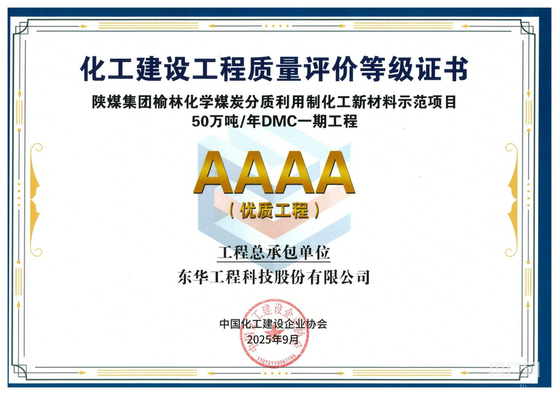 央广网合肥12月31日(记者徐秋韵)近日,由中国化学工程所属东华工程科技股份有限公司总承包的陕煤集团榆林化学煤炭分质利用制化工新材料示范项目50万吨/年DMC一期工程项目(以下简称□▽“陕煤DMC项目”)□,继综合竣工验收顺利通过后再传捷报○▲★,项目荣获2025年度化工建设工程质量评价4A级评价(优质工程)。