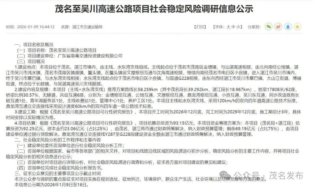 近日▲=▽,湛江市交通运输局发布了《茂名至吴川高速公路项目社会稳定风险调研信息公示》: