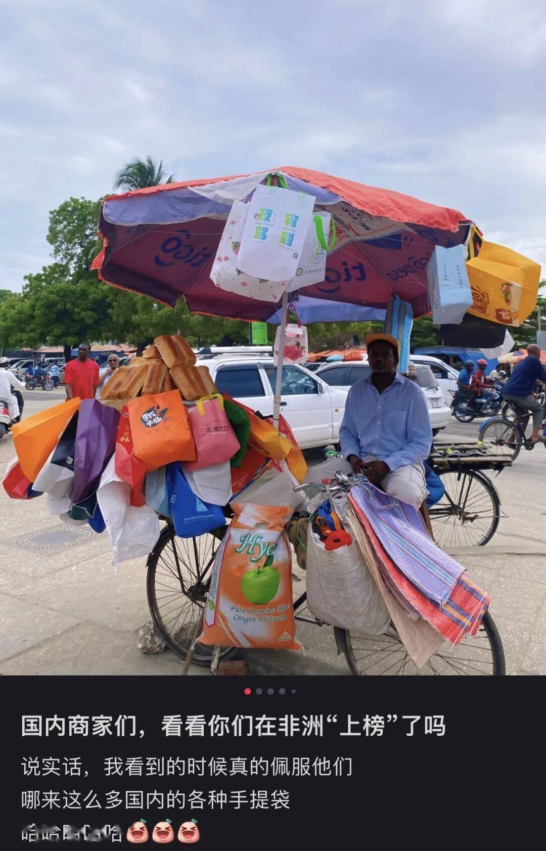 最近这两年,有不少去非洲工作或旅游的国人发现了一个有意思的现象——在很多非洲国家的菜市场、街边摊上,总能看到一些熟悉的“中国元素”——比如印着“外卖来了•★”▲○☆,或是各种奶茶品牌的保温袋子。这些袋子被摊主挂在最显眼的位置,和非洲人民的日常用品摆在一起出售•。