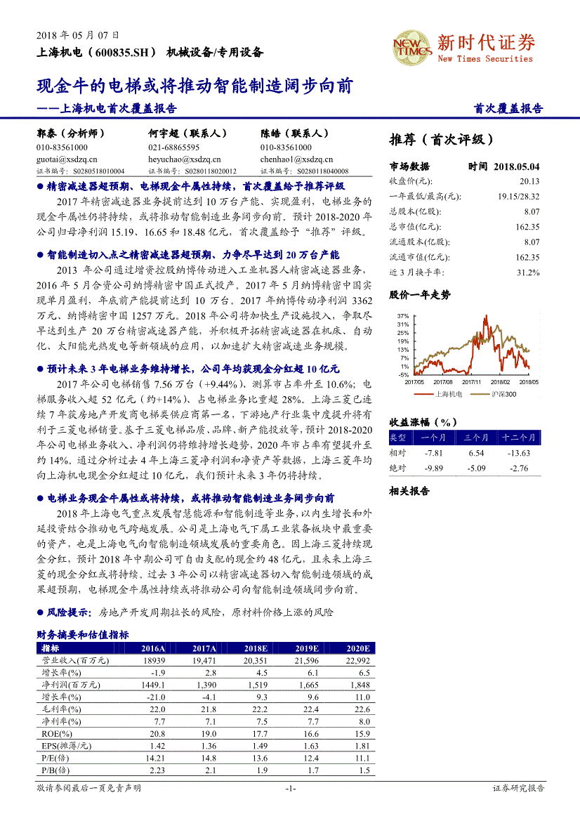 -1-证券研究报告2018年05月07日上海机电(600835.SH)机械设备/专用设备现金牛的电梯或将推动智能制造阔步向前——上海机电首次覆盖报告首次覆盖报告郭泰(分析师)何宇超(联系人)陈皓(联系人) 证书编号:S04 证书编号:S12 证书编号:S08 精密减速器超预期、电梯现金牛属性持续,首次覆盖给予推荐评级2017年精密减速器业务提前达到10万台产能、实现盈利,电梯业务的现金牛属性仍将持续,或将推动智能制造业务阔步向前。